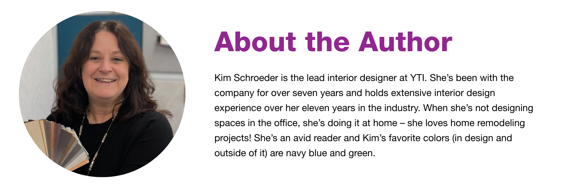 Kim poses in a headshot with design samples in hand.