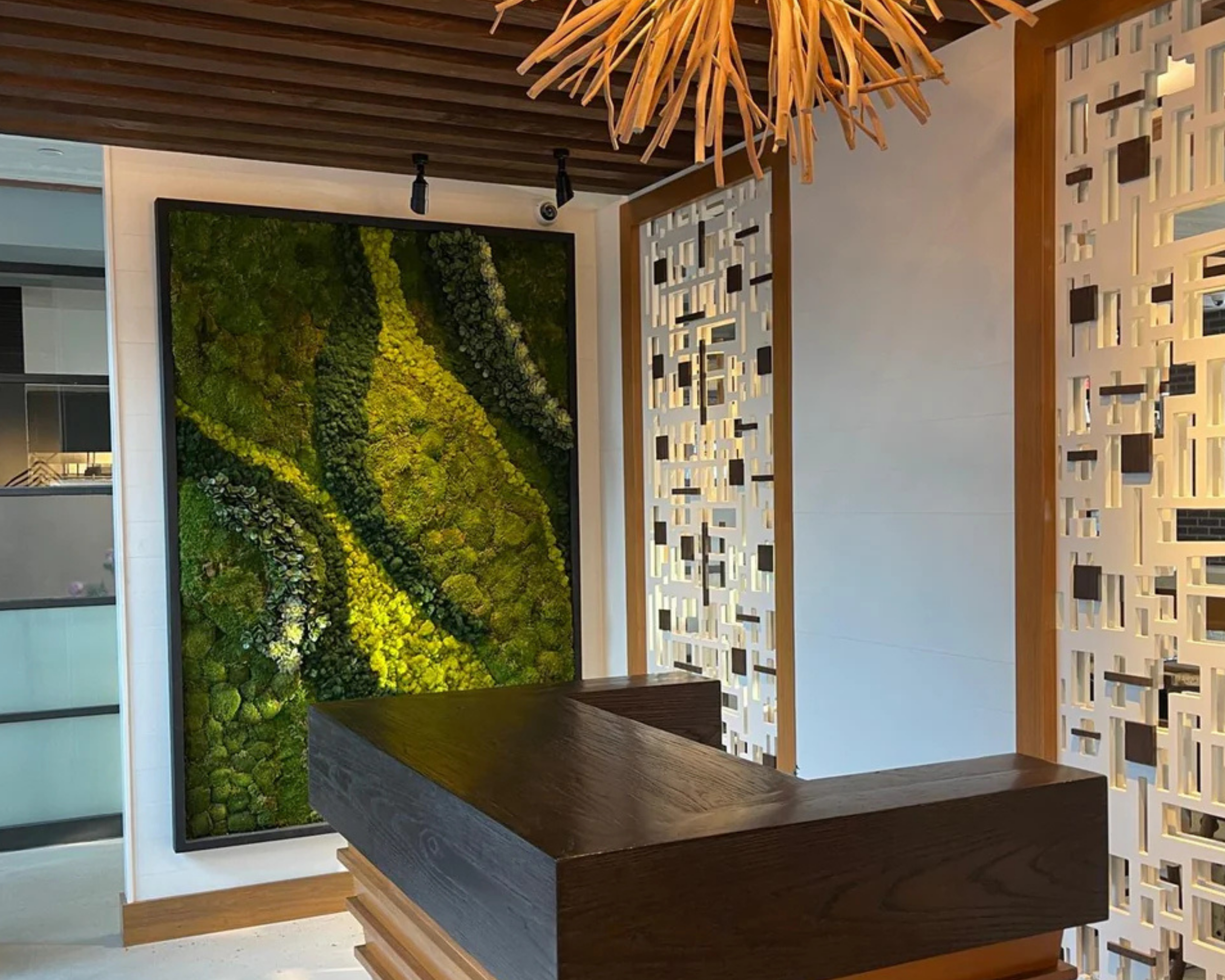 First off, the traditional greenery. Like I said before, this isn’t limited to just potted plants. The picture I chose to represent this shows a gorgeous moss wall, strategically placed at the reception area of a space.