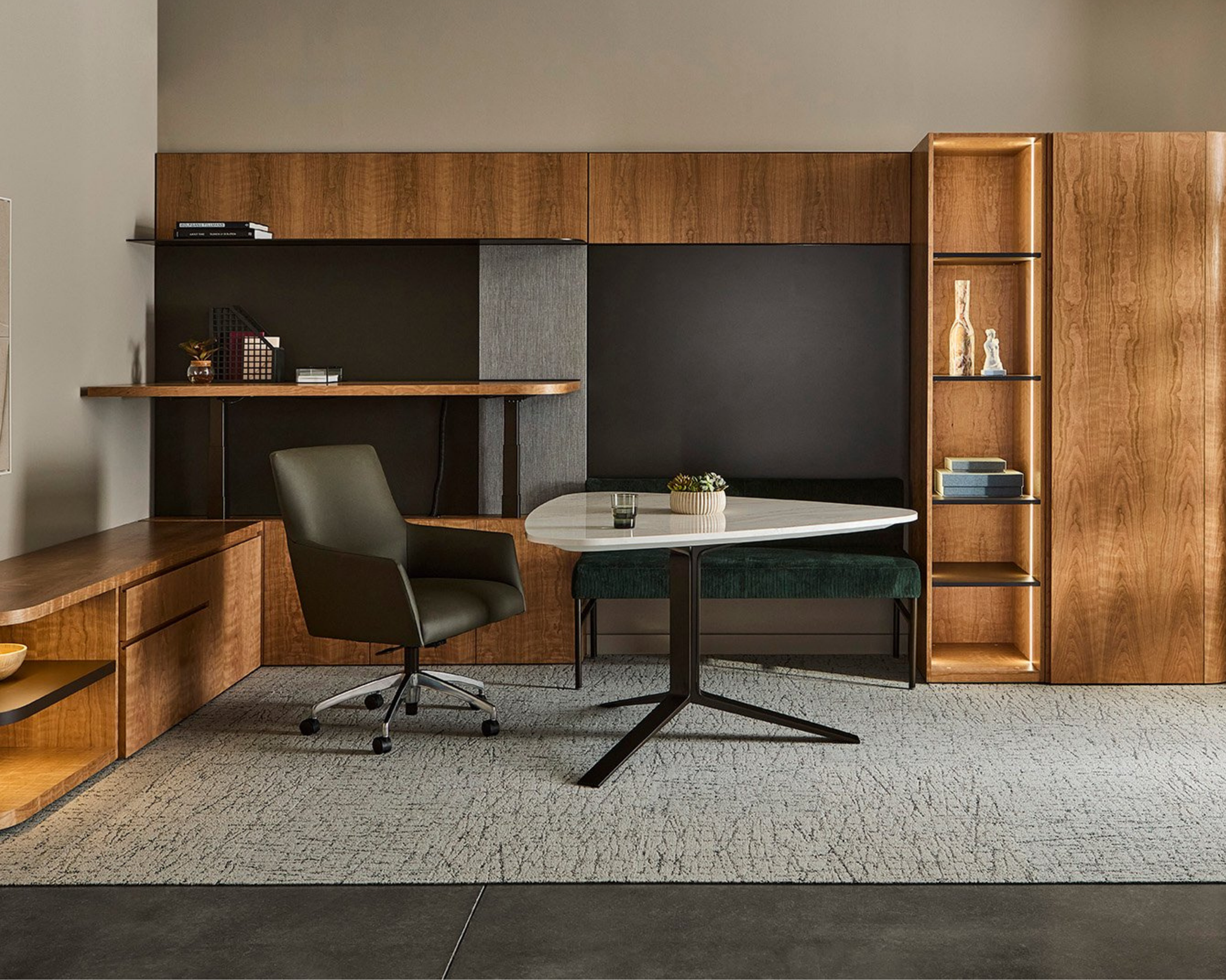 A modern but classic office with a conference chair and wood casegoods.