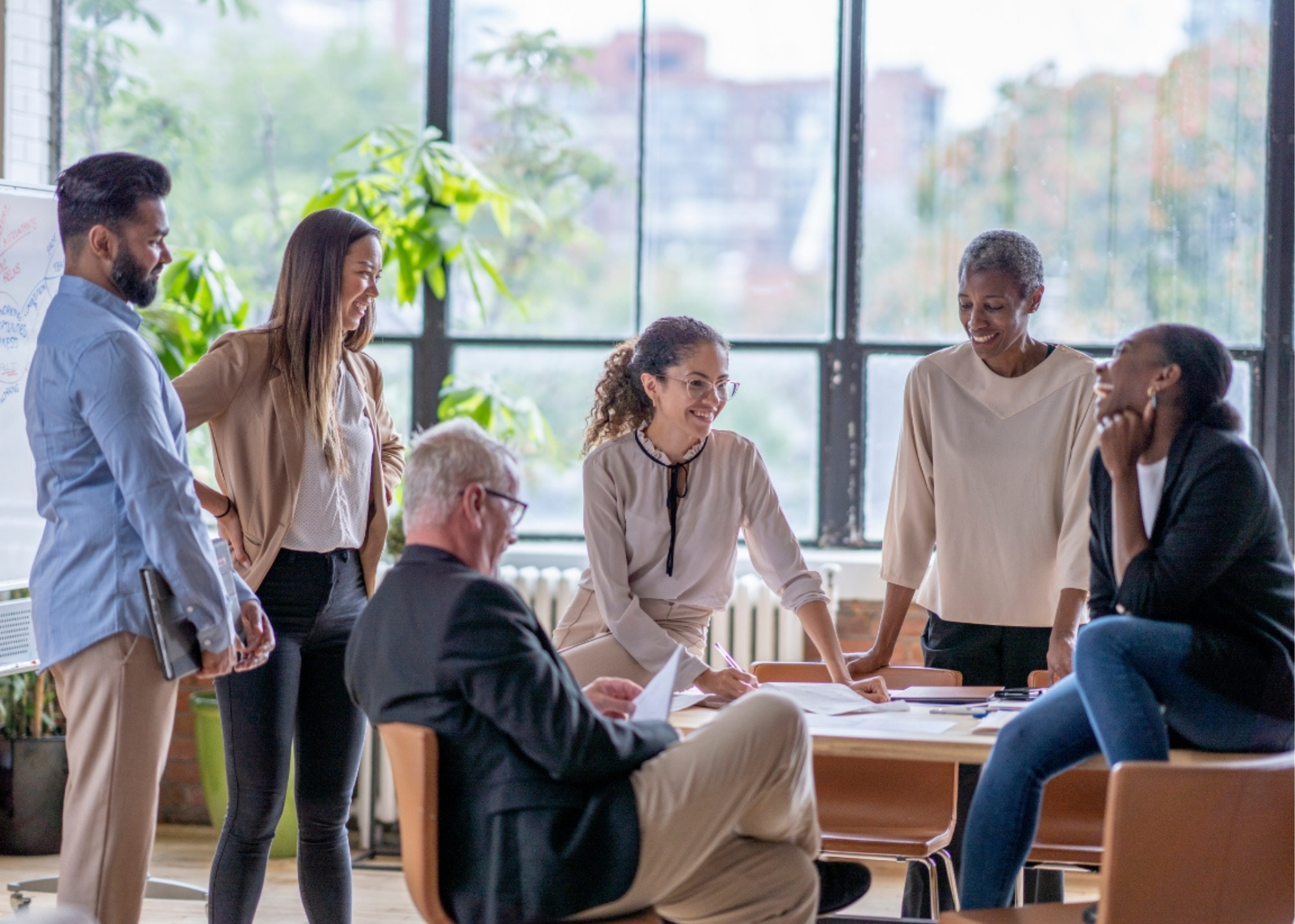 A group of employees gather around a conference table having a discussion.