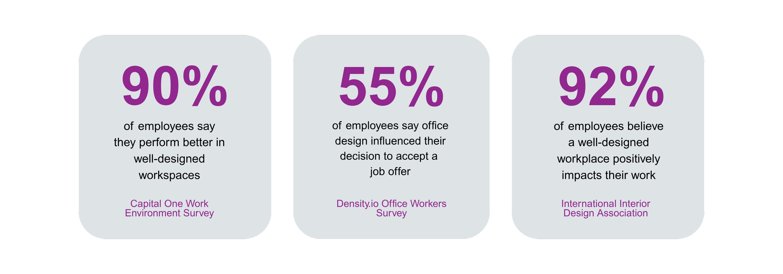The data on this is clear. According to Capital One's Work Environment Survey of 3,608 office professionals, 90% said they perform their jobs better in well-designed workspaces. But the same research found that employee wants are often surprising: the top priorities weren't open-plan layouts or trendy amenities — they were access to quiet spaces for focused work, natural light, and the ability to take breaks throughout the day. Without asking, you'd never know.